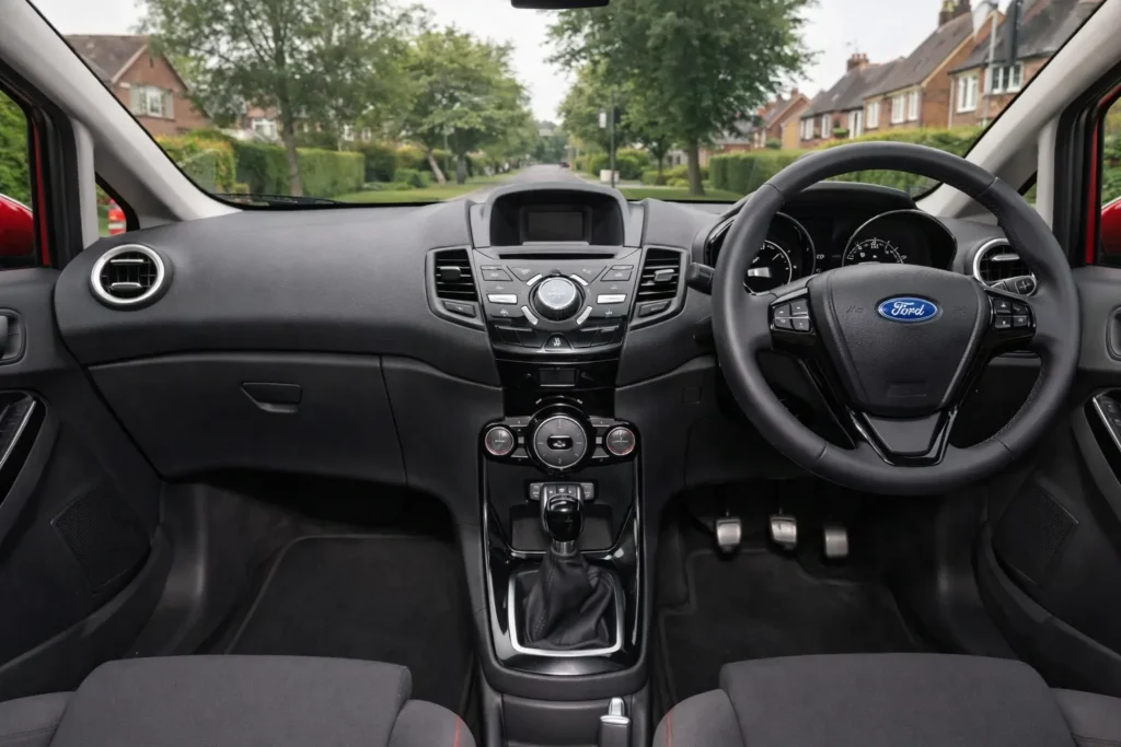 The Ford Fiesta interior is simple but well designed. Everything is easy to use. The controls are clear, and the layout makes sense.