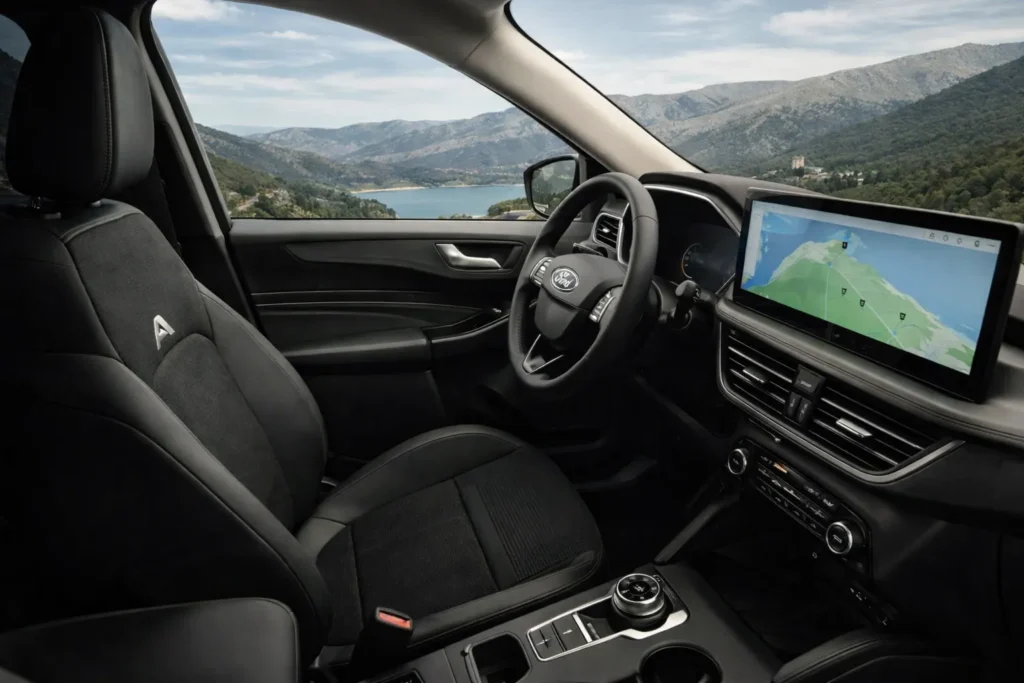 The Ford Kuga interior is simple and clean. Everything is easy to use. The screen, buttons, and controls are placed in a smart way.